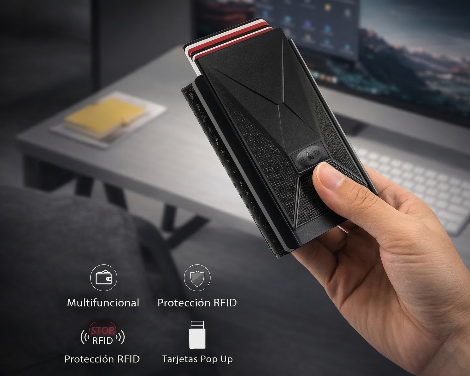 Billetera con protección RFID y tarjetero de aluminio, con sistema automático de expulsión de tarjetas. Diseño minimalista y ultraligero Pack & Go